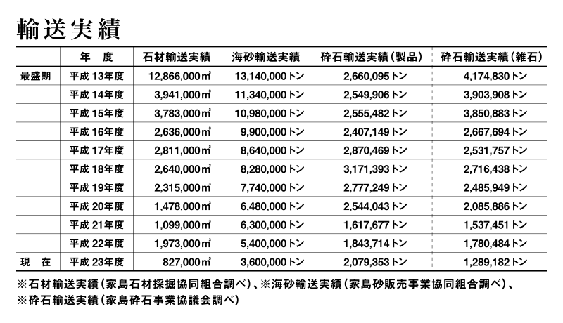 島内には数多くの岩脈があり、最盛期には年間約1,300万m3※を産出した豊富な資源は、現在もなお枯れることがありません。